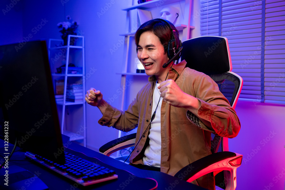 Asian young esport male gamer playing online video game on computer.