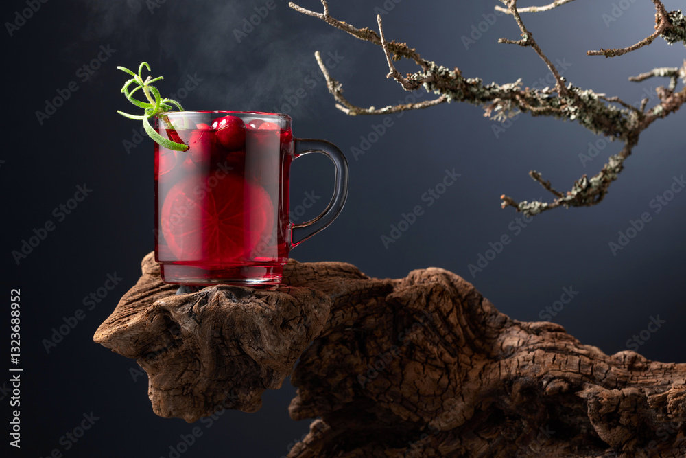 Hot drink with cranberries, lime, and rosemary on a old wooden snag.