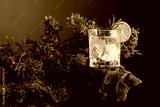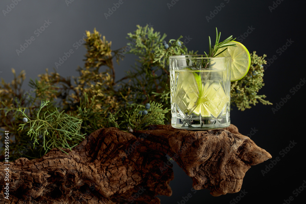 Refreshing hard seltzer with ice, lime, and rosemary on an old snag.