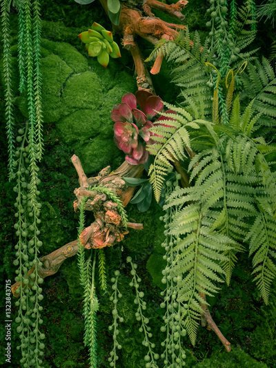 Beautiful vertical wall of the building consisting of many plants. Ideas for interior and exterior design and background