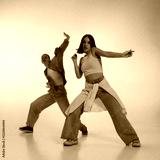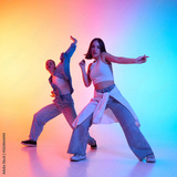 Hip hop dancers in casual attire striking dramatic poses against bold neon gradient lighting. Concept of urban movement, youth expression, passion for dance, street culture, freestyle choreography.
