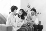 笑顔でスマホを見る小学生の女の子の家族