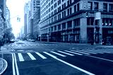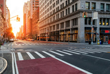Empty cityscape with no people at the intersection of 5th Avenue and 23rd St in New York City with sunlight shining between the background buildings