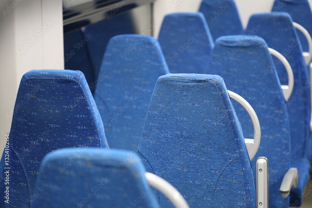 Row of blue seats on a train interior, great for travel or public transportation concepts.