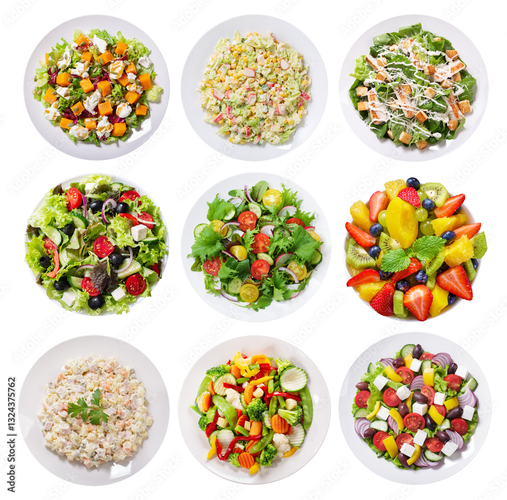 Set of various plates of salad isolated on transparent background, top view