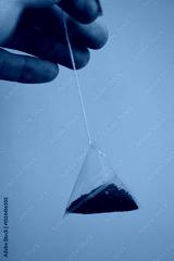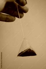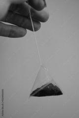 A person holding a tea bag with a string, possibly for steeping or removing the bag.