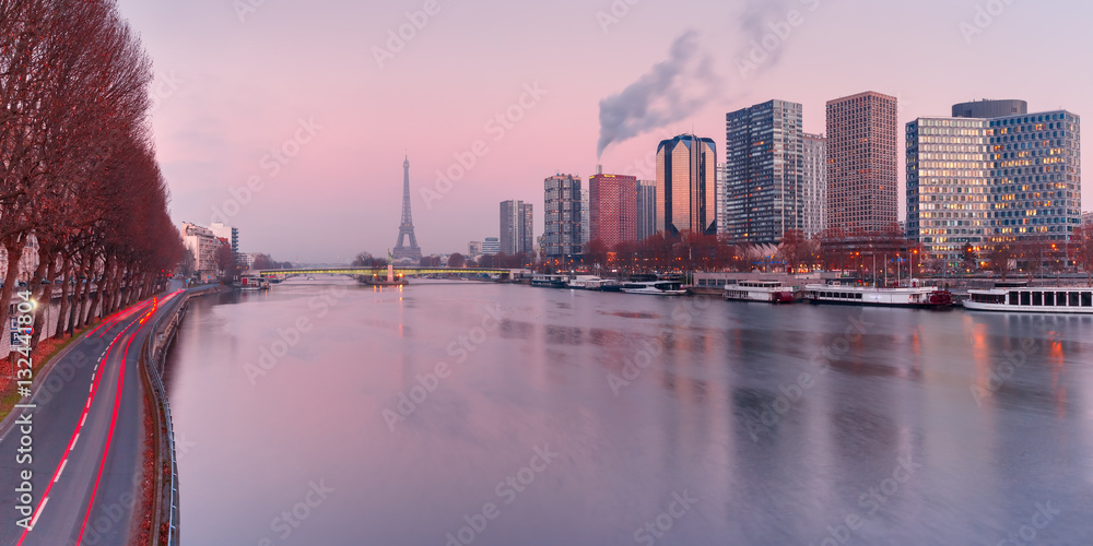 Panoramic Paris cityscape with Eiffel tower, quay de Grenelle and Andre Citroen and its reflection in the river Seine at sunset, as seen from bridge Pont Mirabeau, France