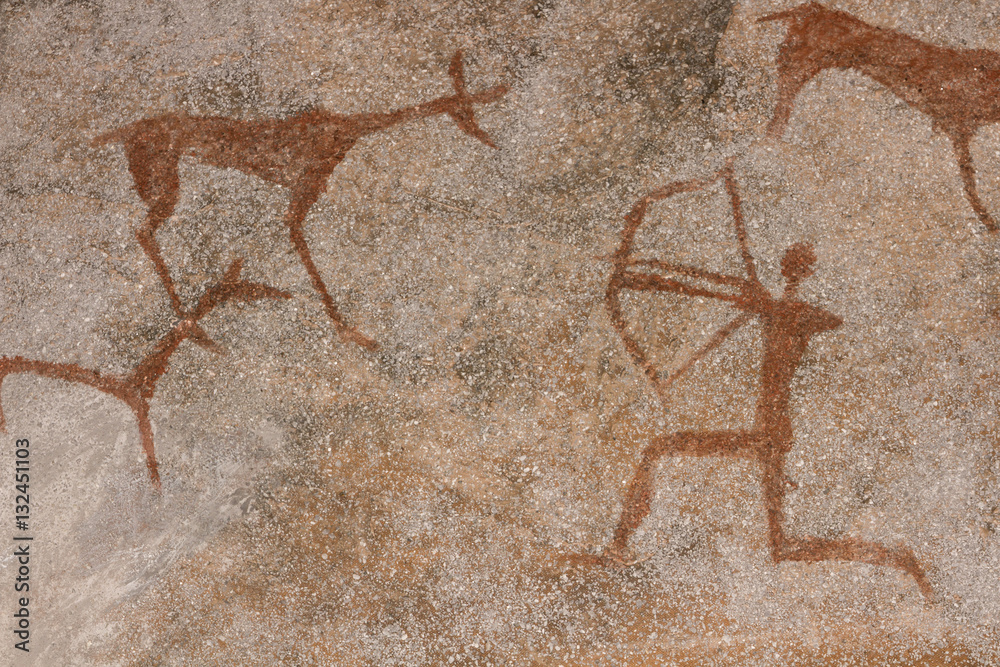 Drawing on a rock cave wall ocher paint, ancient prehistoric Neanderthal man. man surrounded by prehistoric animals, head of intelligence, radiance, lord