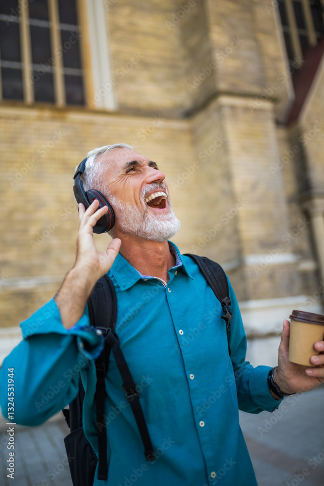 Older man listening to the music with coffee in his hands. Walking through city center.