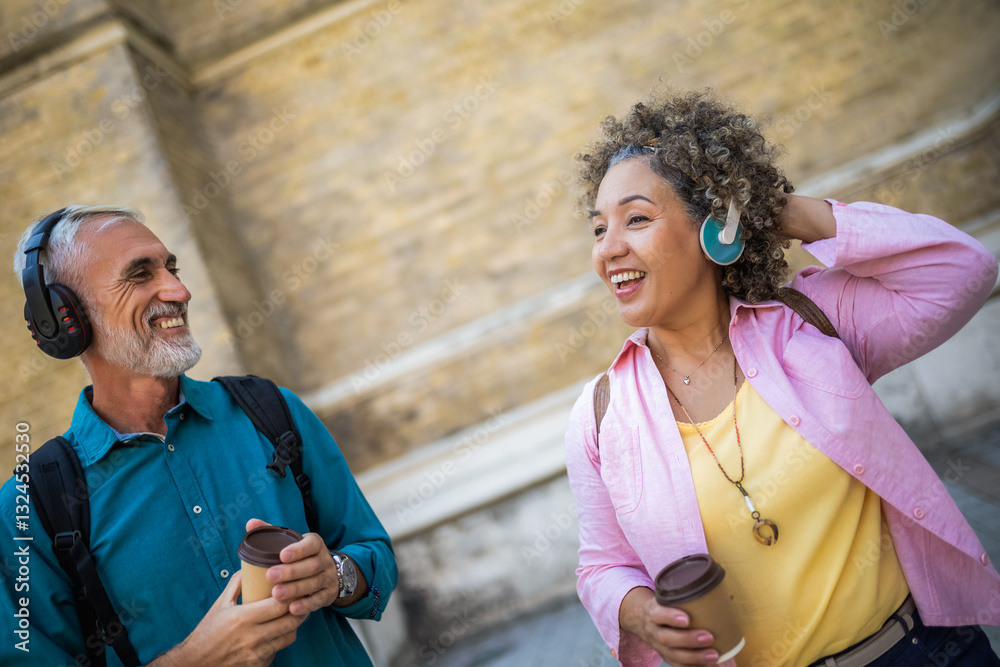 Older mixed married couple having headphones on. They are drinking coffee and dancing to the music. Exploring and traveling concept.