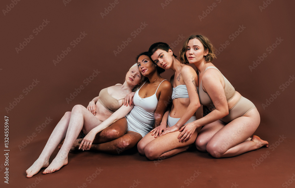 Group of multiethnic women with different kind of skin posing together in studio. Concept about body positivity and self acceptance