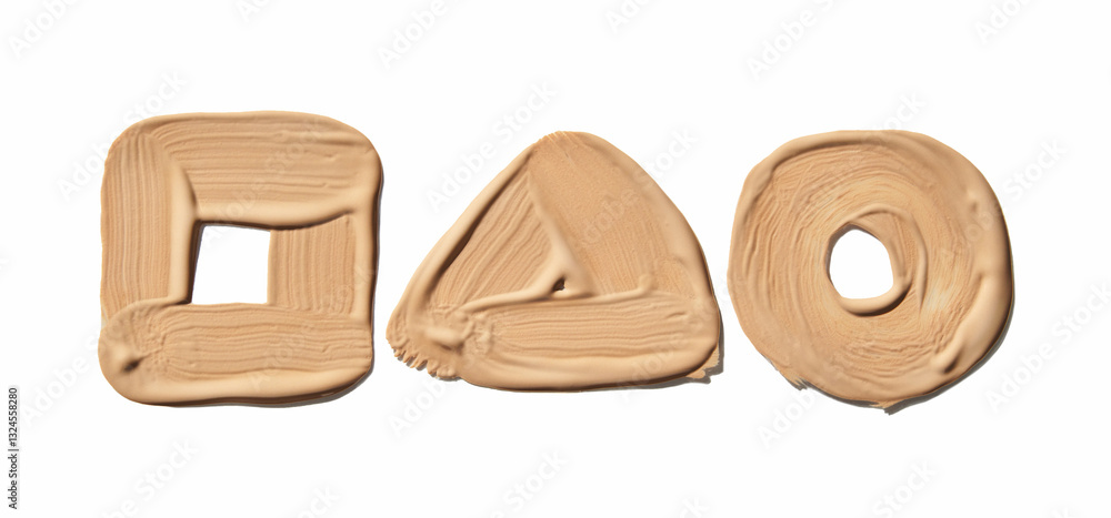 Beige makeup smudges forming square triangle and circle shapes on white background.