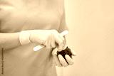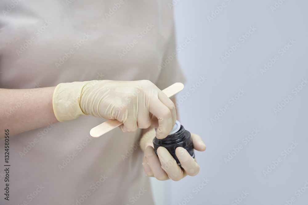 Female adult preparing cosmetic treatment with gloves and wooden spatula in skincare clinic setting.
