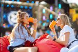 Happy women having fun at a music festival with beer in their hands. Two female friends enjoying the sunset on the beach. Leisure, party concept. Active lifestyle.