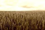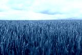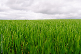 Green fresh sprouts of green wheat with clouds overhead. Agricultural landscape of green field. Harvest concept.