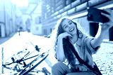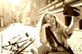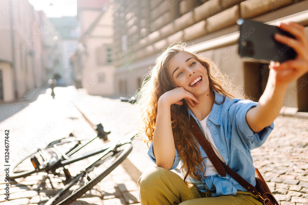 Happy tourist with a bicycle takes a selfie on a sunny street. A beautiful woman enjoys a walk and shoots a blog. Tourism, recreation concept.