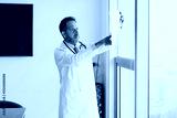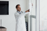 Senior latin man doctor specialist looking at an x ray scan at office or hospital in Mexico Latin America