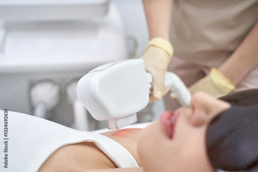 Asian female receiving laser hair removal treatment at beauty clinic under professional care.