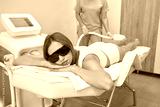 Caucasian female receiving laser hair removal treatment in clinic spa setting with professional technician.