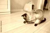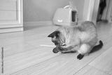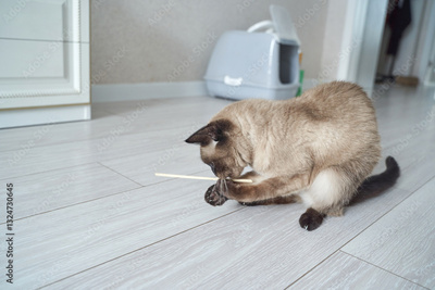 Siamese cat playing with straw on wooden floor near cat litter box in bright room.