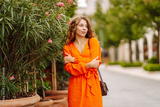 Cheerful tourist in a bright dress walks along a beautiful street. A young woman enjoys the weather outdoors. The concept of walking, vacation, travel. Active lifestyle.
