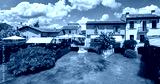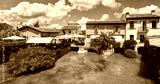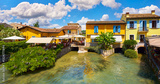 Old village Borghetto Valeggio sul Mincio, Veneto region, Italy. Colorful houses. Panoramic view at the town house on river. Sunny day with blue sky and clouds.