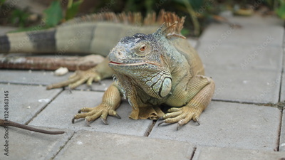 Portrait of a Green Iguana or is a species of herbivorous lizard that has a large body. It has thick skin and rows of spines along its back and tail.