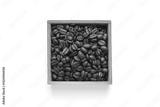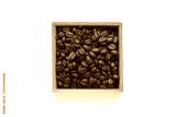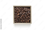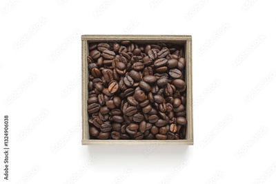 Full City Roast, medium roast coffee beans in a wooden box on a white background isolate