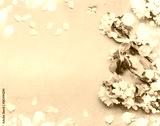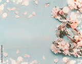 Pretty spring blossom on light blue background with bokeh, top view, pastel color, border