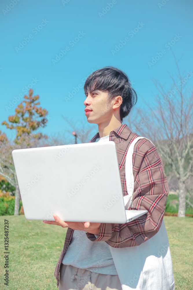 Young Asian male student using a laptop in a green outdoor space. Focused man working on a computer in a park. Remote study, online learning, or freelance work in a natural environment.