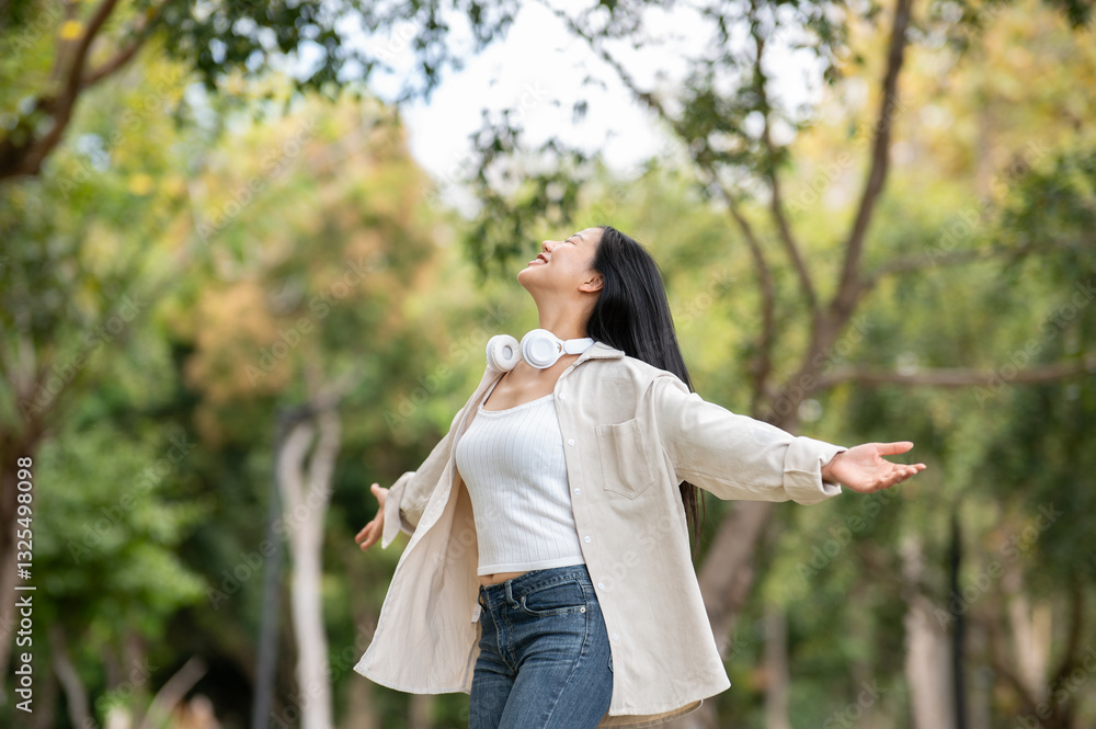 An asian woman is standing with open arms while turning around in the park, breathing in fresh air.