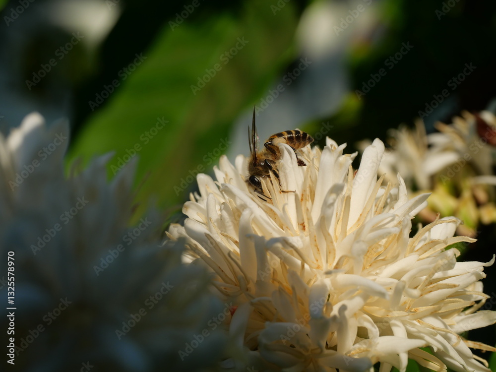 Honey bee on Robusta coffee blossom on tree plant with green leaf with black color in background. Petals and white stamens of blooming flowers
