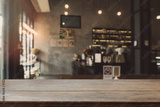 Wood table top and blurred bokeh cafe and coffee shop interior background with vintage filter - can used for display or montage your products.