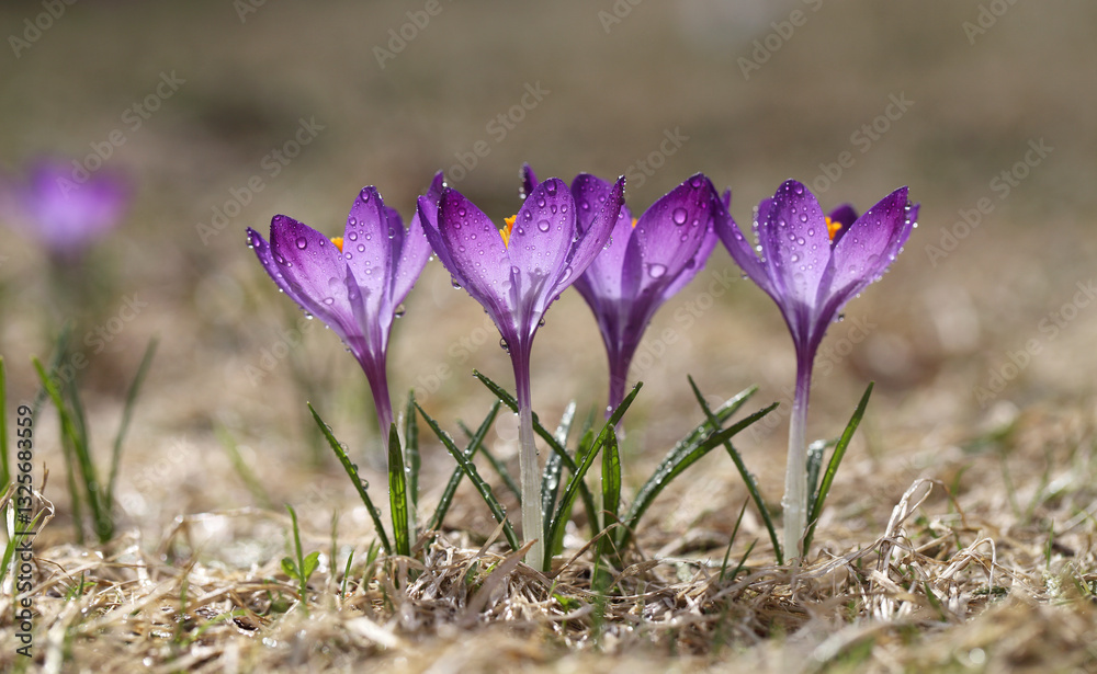 Purple crocuses on a background of glittering snow, beautiful spring flowers. Template for a card for Easter and Mother's Day.