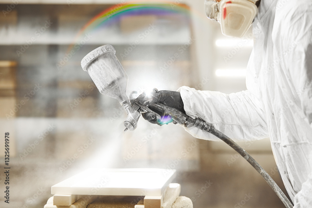 Close-up of industrial worker using paint gun or spray gun for applying paint, airless spraying.