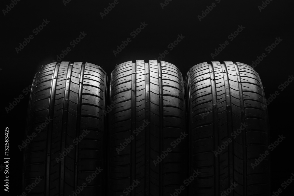 Studio shot of a set of summer, fuel efficient car tires on black background. Contrasty lighting and shallow depth of field