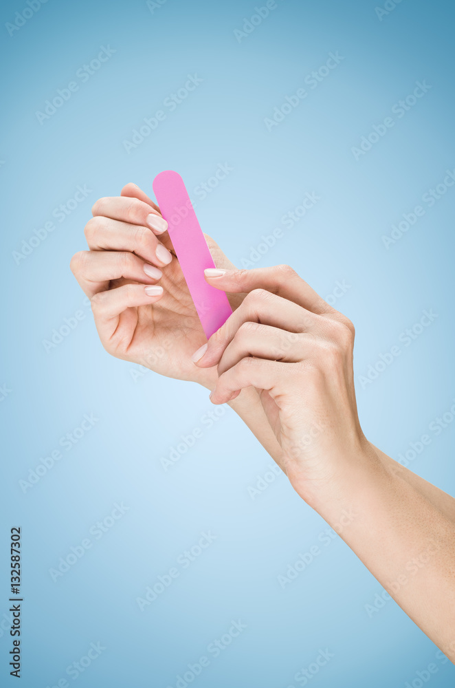 Woman's manicure concept for advertising. Background with beautiful manicured female hands and nails. Skin, body care or spa treatment concept with natural nail manicure