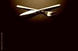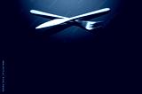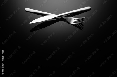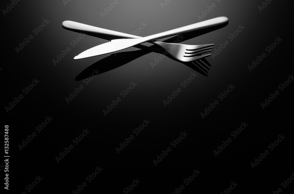 Black food background. Stainless steel, modern silverware on black background with reflection. Image with copy space. Symbol or concept for diners, cafes and good food competitions and festivals