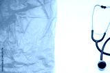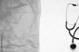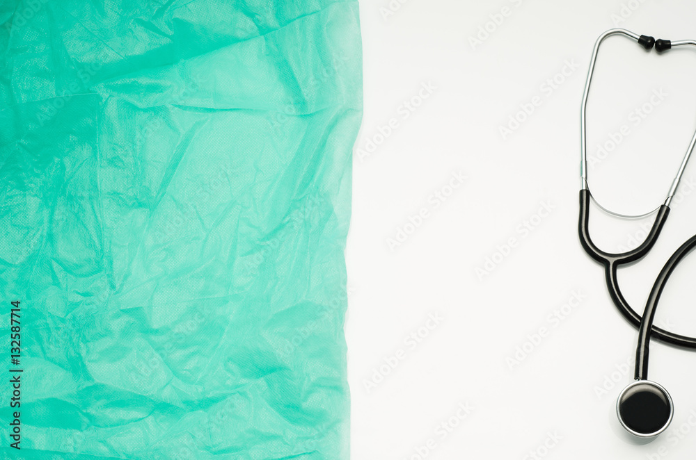 Top view of modern, sterile doctors office desk. Medical accessories on a white table background with copy space around products. Photo taken from above.