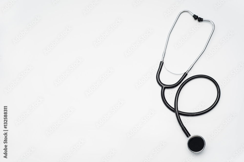Top view of modern, sterile doctors office desk. Medical accessories on a white table background with copy space around products. Photo taken from above.