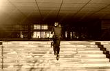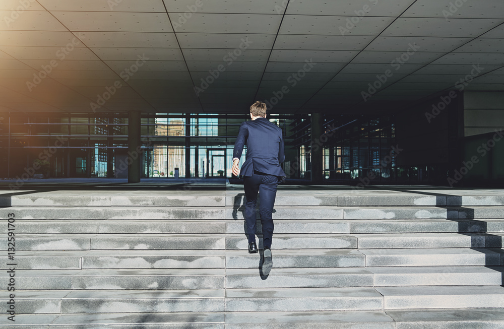 Runnig upstairs fast man wearing blue suit