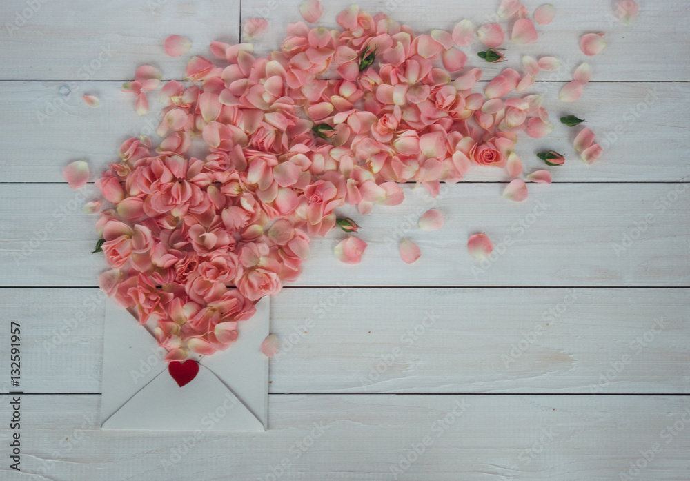 Valentine's day. Flowers and love letter on wooden background. Retro style.