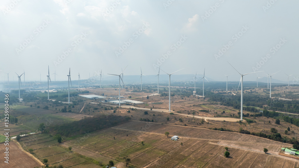 Aerial view of wind turbines and agriculture field..