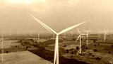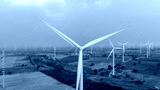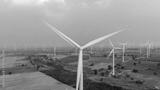 Aerial view of wind turbines and agriculture field..