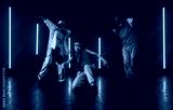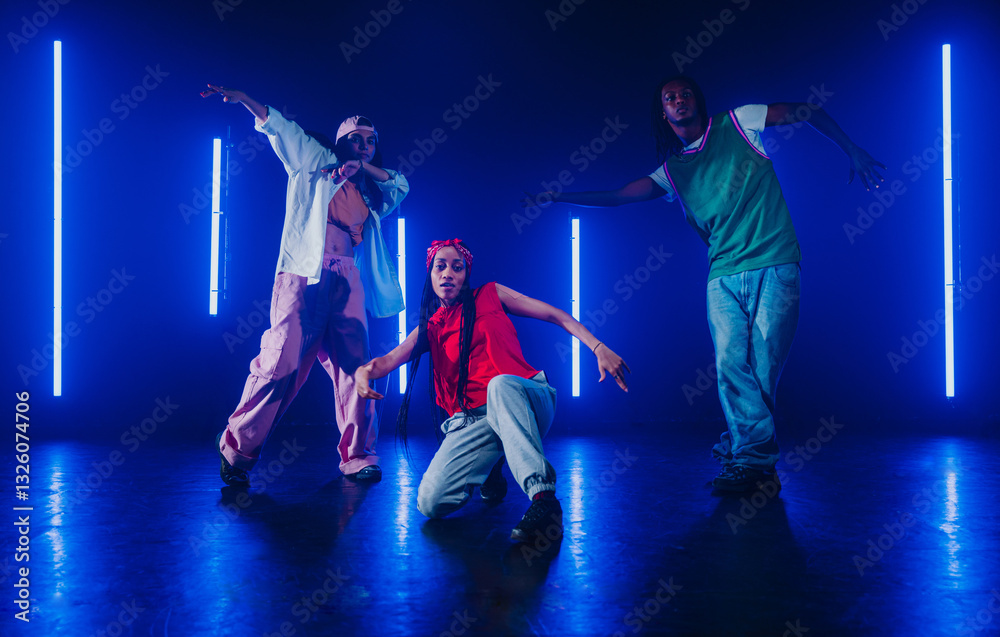Group of hip hop dancer dancing together in a moody studio with tube neon lights.