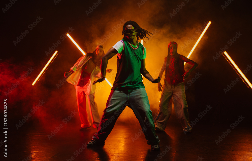 Group of hip hop dancer dancing together in a moody studio with tube neon lights.