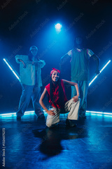 Group of hip hop dancer dancing together in a moody studio with tube neon lights.