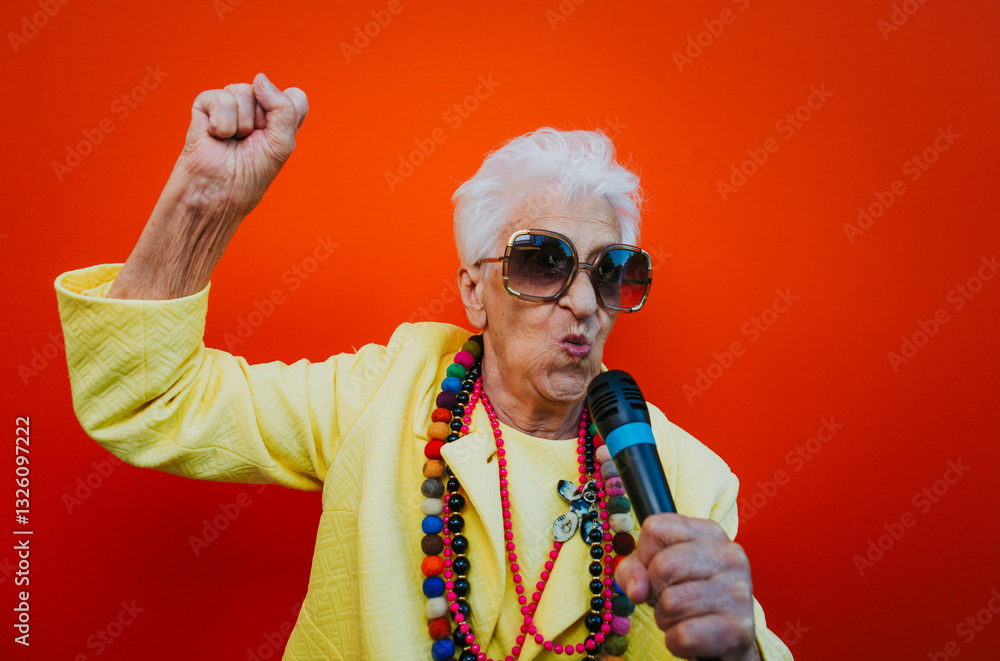 Funny grandmother portraits. Senior old woman dressing elegant for a special event. Rockstar granny on colored backgrounds