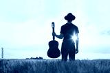 music festival background, silhouette of musician artist with acoustic guitar at sunset field.