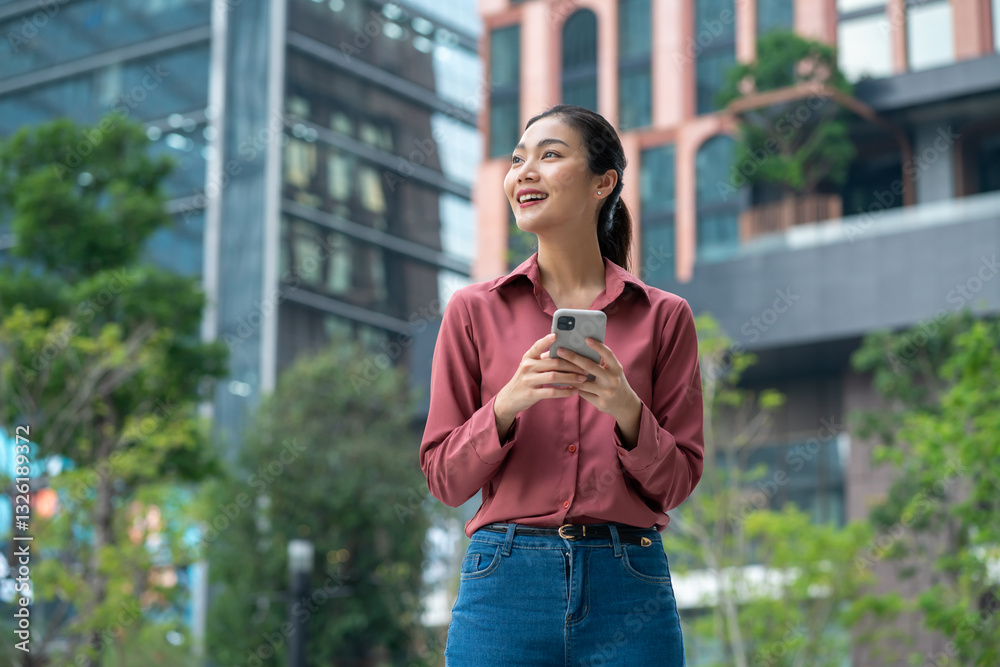 Successful asian business woman using phone outdoors.Happy businesswoman holding cellphone using smartphone or mobile phone standing or walking on city urban street,5g communicating with a colleague.
